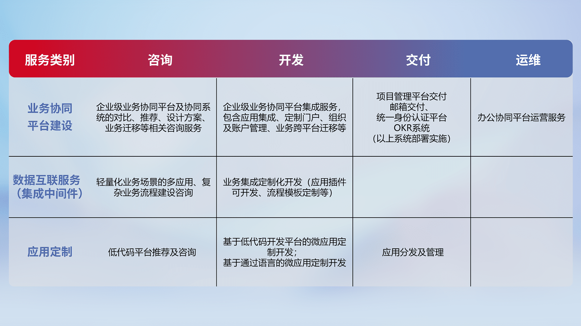 针对钉钉、、企微、、、IDaas等平台级产品提供产品的规划、、方案、、、交付、、、定制化开发等服务,,,,实现如统一协同办公、、智能客户服务、、、、混合会议管理、、、、智能数据查询、、等业务场景,,,,实现数字化转型。。。。